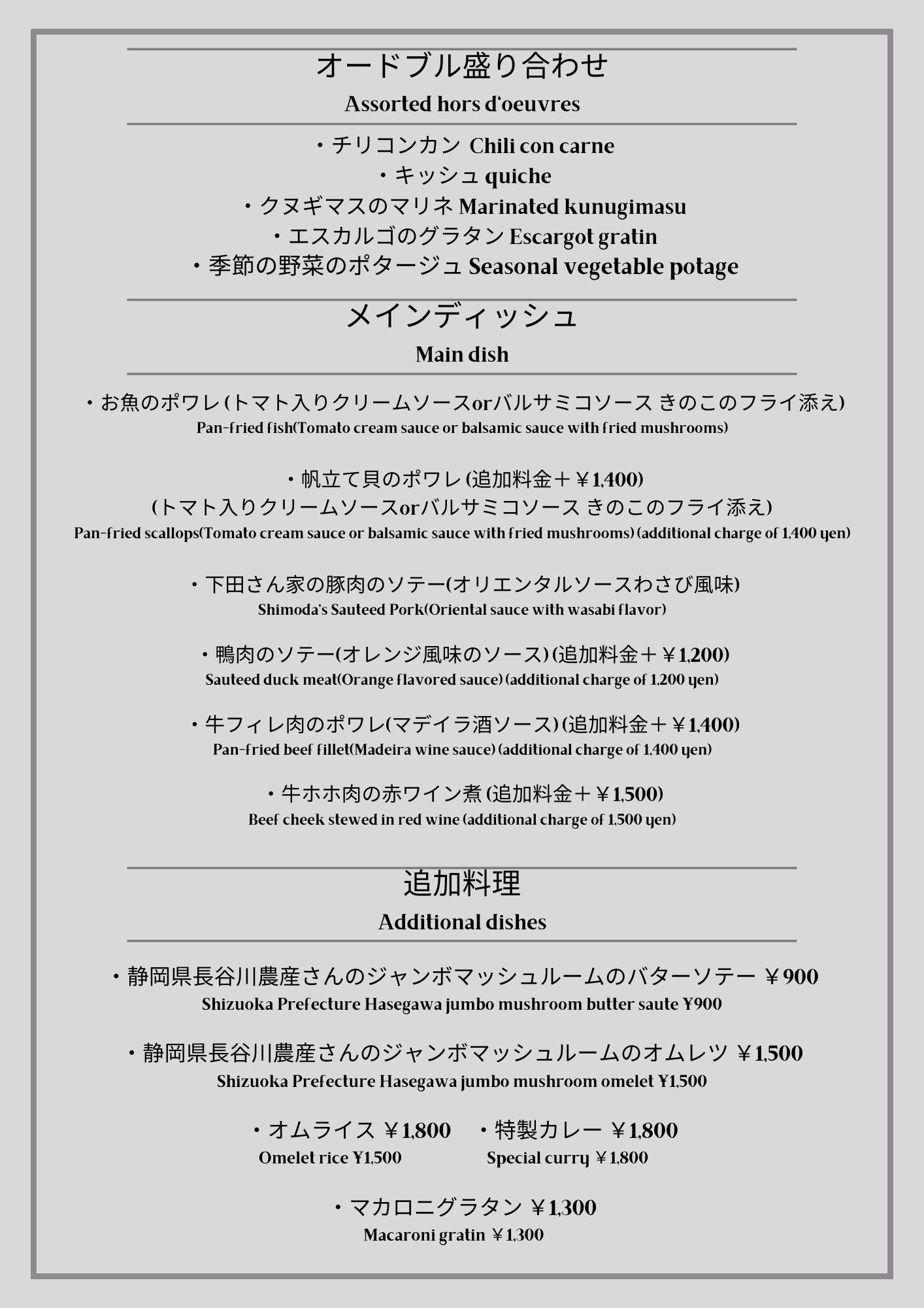 家庭的なフランス料理店です。季節の食材、地元の野菜を取り入れた日替わりのコース料理をベテランシェフがご用意しております。