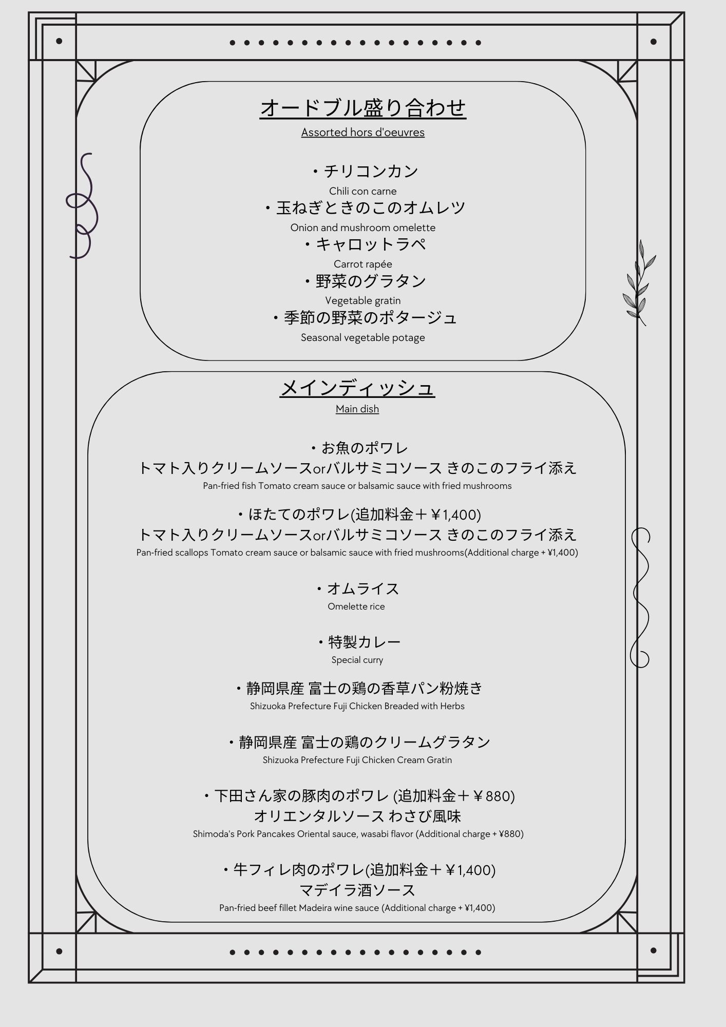 予算 | ランチ 3,900円〜 / ディナー 5,500円~+1ドリンク制 |