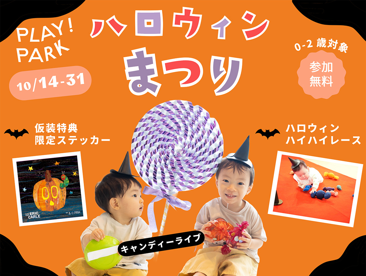 今年のハロウィンは、仮装して遊びに来ると、もれなく「ハロウィン限定ステッカー」をプレゼント!小さな魔女に変身して、キャンディ型マラカスでの演奏会やハイハイレースに参加しよう。