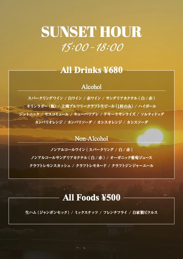 夕日を望みながら嗜む一杯、この特別な時間をより皆様達と共有したいと思いサンセットアワーを始めます。