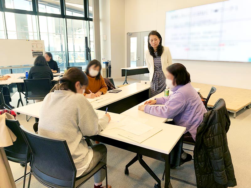 五十嵐先生は20年以上携わった女性の創業支援のスペシャリストです。講義内容はもちろん、ワークショップのテーマに至るまで一貫して“キラリ”探しの重要性を様々な切り口から受講者にわかりやすく伝えてくださいました。なぜなぜなぜを繰り返し深掘りすることで解像度が上がらなければ、顧客(ターゲット)へは刺さらないし、広くあまねく顧客を集めれば良いというものでもありません。なにより夢を実現していくステップとして、まずは参加者が考える夢を具体化(言語化)し、さらにそのためには、誰のための、どんな事業内容であるか、どうしてそれをやりたいのか、そう思ったきっかけ、動機といった自分の内面を深く掘り下げ目的を明確化することが起点になっていること。目的、目標を言語化することの重要性は、理解はしているものの行動に移せないことが多いのですが、そのハードルをさげてくれるのが五十嵐先生のノウハウだと実感しました。